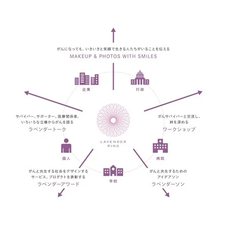 がん治療は昔と比べて格段に進化を遂げました。でもがんへの偏見や間違った認識はまだまだ多く存在します。日本人の二人にひとりがなるという、身近な病気にもかかわらず、裏を返せば、がんを正しく理解するということはこの国の多くの人を思いやることにつながる、と言えます。がんになった人はもちろん、なっていない人も共に笑顔で過ごすことができる未来へ。LAVENDER RINGはそんな思いから誕生しました。