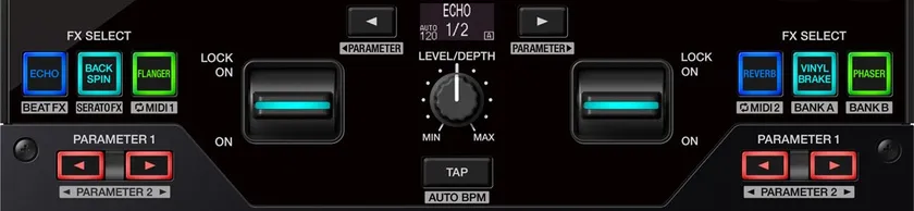 本機に内蔵されている22種類のBEAT FXや、Serato DJ Proとrekordboxに搭載されているさまざまなエフェクトを大型レバーでダイナミックにON/OFF操作することができます。エフェクト選択ボタンに割り当てられた6種類のエフェクトは簡単に入れ替えることができ、搭載された有機ELディスプレイでエフェクトの種類や拍設定も迷わず手元で確認できます。