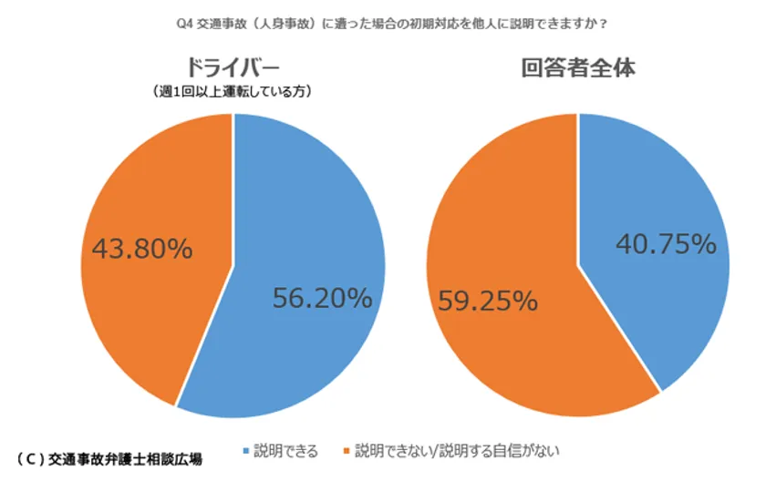 残りの43.8%は「説明できない/説明する自信がない」を選んでおり、ドライバーの5人に2人以上は、交通事故への初期対応を正しく理解しないまま運転していることがわかりました。