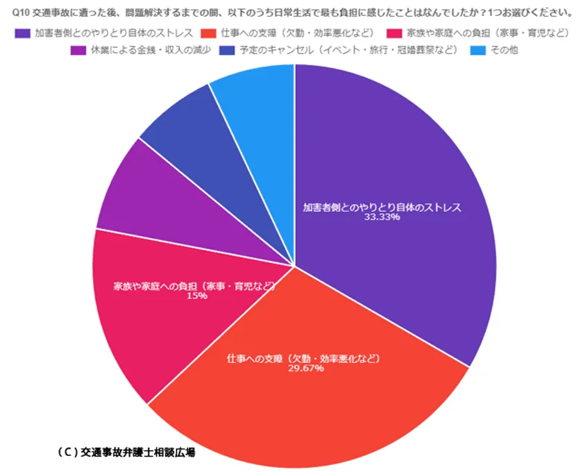 交通事故に遭ってから問題が解決するまでに、日常生活のどんな点に負担を感じたかをうかがったところ、最も多かったのは「加害者側とのやりとり自体のストレス」(33.33%)でした。