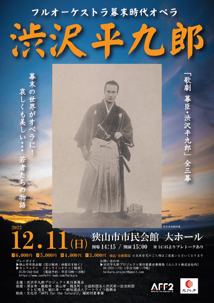 渋沢平九郎プロジェクト実行委員会主催、『歌劇 幕臣・渋沢平九郎』が2022年12月11日 (日)に狭山市市民会館 大ホール(埼玉県狭山市入間川2-33-1)にて上演されます。