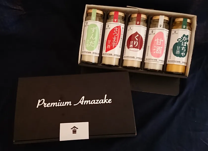 老舗麹屋が造った甘酒・ずんだ甘酒・さつま芋甘酒・かぼちゃ甘酒・くり甘酒の5種が専用の化粧箱に入った詰め合わせです。