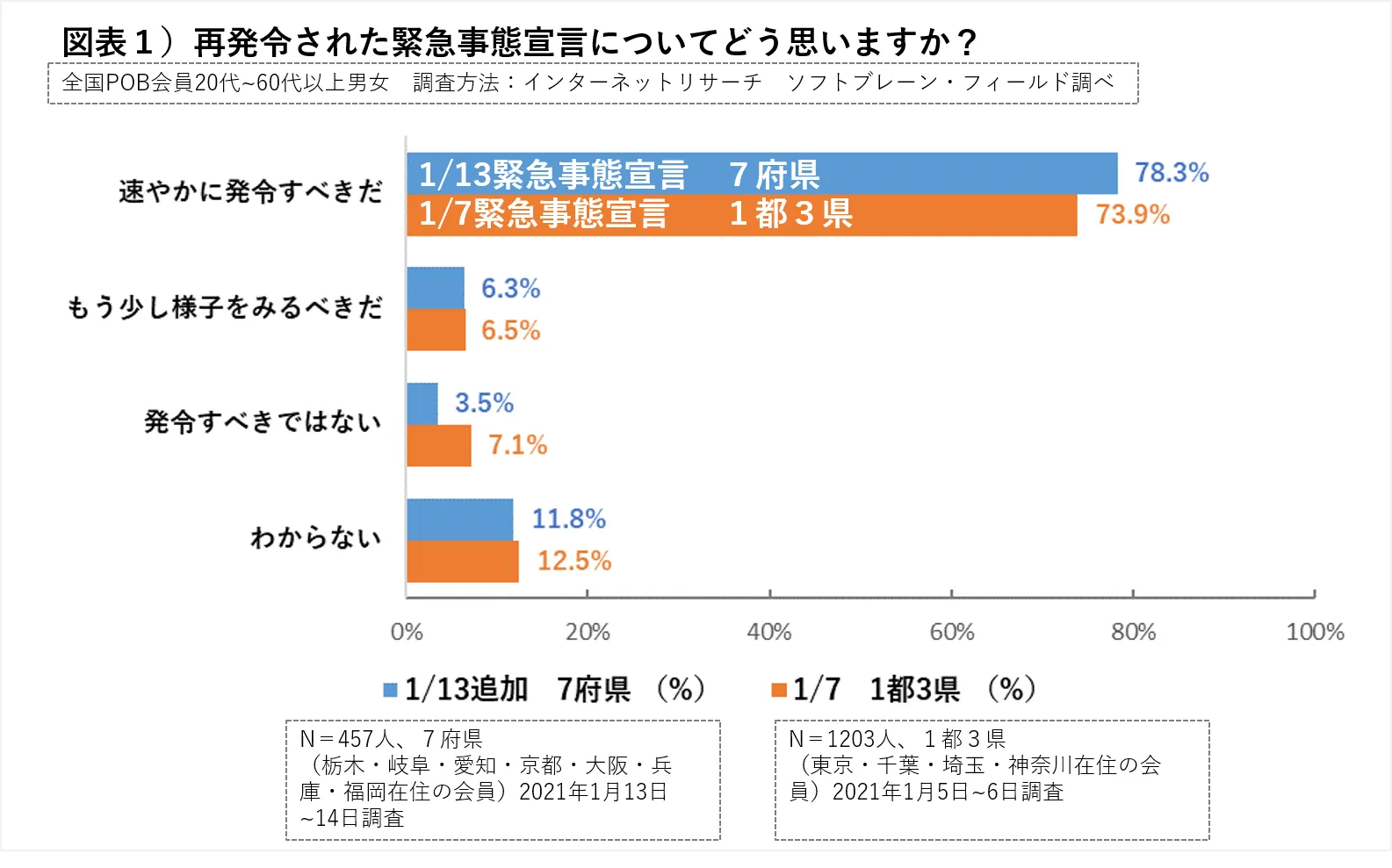 再発令された緊急事態宣言について、「速やかに発令すべき」と多くの人が回答し、7府県会員457名のうち、78.9%、1都3県会員1203名では、73.9%となり、7府県エリア会員が4.4pt上回りました。