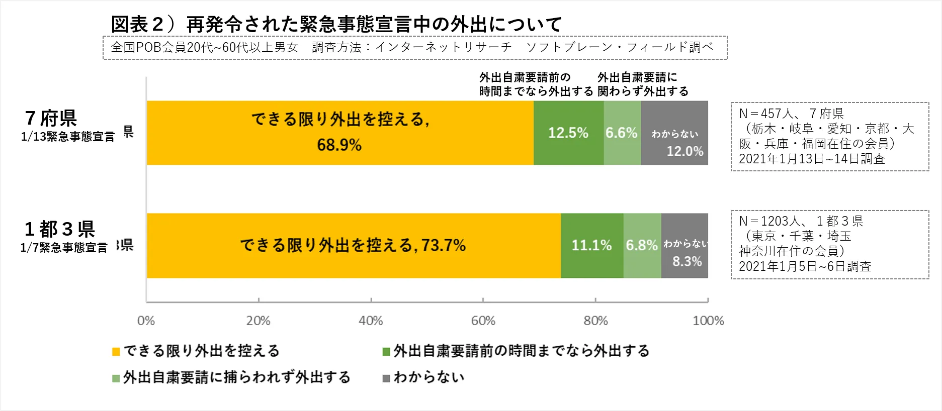 そこで、フィールド・クラウドソーシング事業を展開するソフトブレーン・フィールド株式会社(本社:東京都港区、代表取締役社長:木名瀬博)は、今月7日配信した「1都3県の会員を対象とした緊急事態宣言に対するアンケート調査」に続き、新たに追加された「7府県の会員を対象としたアンケート調査」を実施しました。(N=457人、調査期間2021年1月13日~14日)今回のアンケート調査では、再発令された緊急事態宣言の方針でもある、「外出自粛」や「テレワークの実施」において1都3県と7府県における意識の比較調査結果をまとめました。