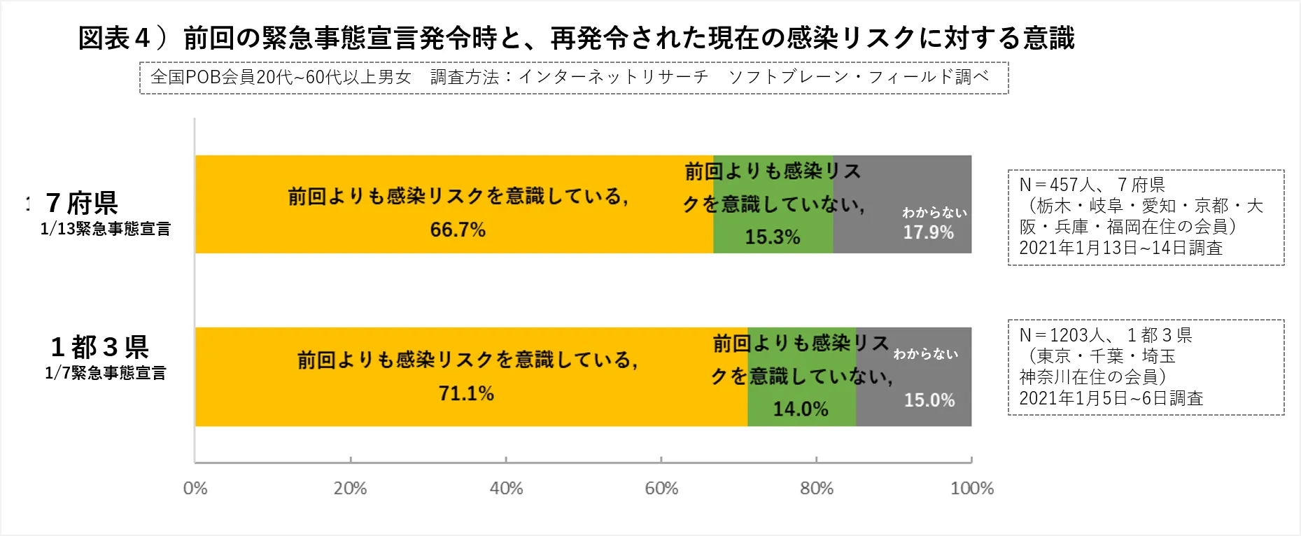 最後に、前回の緊急事態宣言発令時と、現在において感染リスクの意識について尋ねると、「前回よりも感染リスクを意識している」とおよそ7割が感じており、7府県会員では66.7%、1都3県会員では71.1%となり、7府県会員が4.4pt下回る結果となりましたが、コメントをみると、「感染者数の急激な拡大」や「変異種ウイルスに対する不安」だけではなくといった、「市内でも感染拡大が広がっている」「職場でも感染した人がいるから」などといった、首都圏だけではなく、地方でも感染が急拡大し、感染への危機感が表れた一方で、感染リスクへの意識は1都3県よりもやや低い傾向がみられました。
