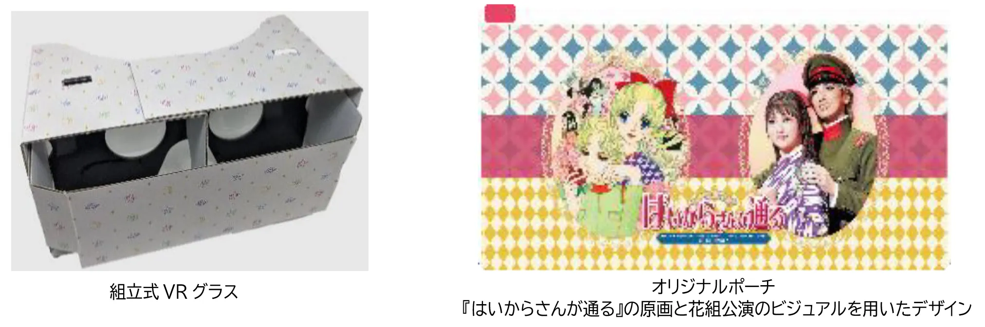 お手持ちのスマートフォンをはめ込んでご使用いただける、組立式のVRグラスを初回生産限定で発売いたします[3,850円(税込)]。付録のQRコードから、花組公演『はいからさんが通る』のVRダイジェスト映像がご覧いただけるほか、VRグラスを折りたたんで収納できるオリジナルポーチもセットにしました。