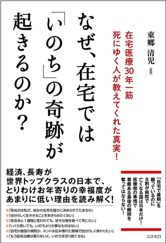 総合出版コスモ21(本社:東京都豊島区、代表取締役:山崎 優)は、地域包括ケアシステムが提唱されている現場で在宅医療に取り組んできた医師の目に映った現実を克明に取り上げた新刊『なぜ、在宅では「いのち」の奇跡が起きるのか?』を発売開始しています。終末期をどこで過ごすのか、病院か在宅か、延命処置をするかしないか、そんな究極の迷いに応える書籍です。