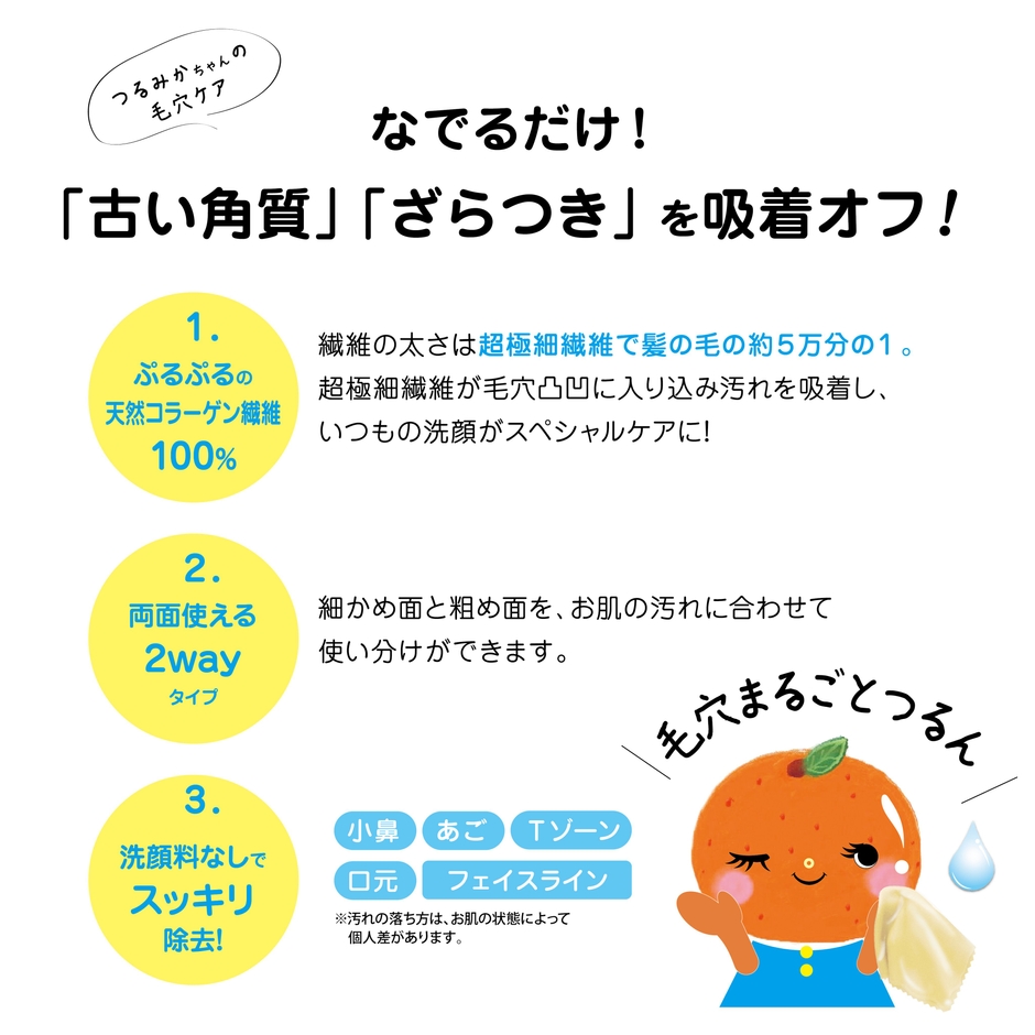 いつもの洗顔では取り切れない古い角質やメイク残り。セームパワー洗顔クロスは、超極細天然コラーゲン繊維が、肌を傷めず汚れをしっかり取り、指では届かない毛穴の汚れや古い角質を優しくからめ取り、つるつるのお肌に磨きあげます。繊維の太さは超極細繊維で髪の毛の約5万分の1。細かい面と粗い面をお肌の汚れに合わせて使い分けたり、洗顔料なしで顔周りや小鼻、Tゾーンといった箇所の汚れをスッキリ除去します。