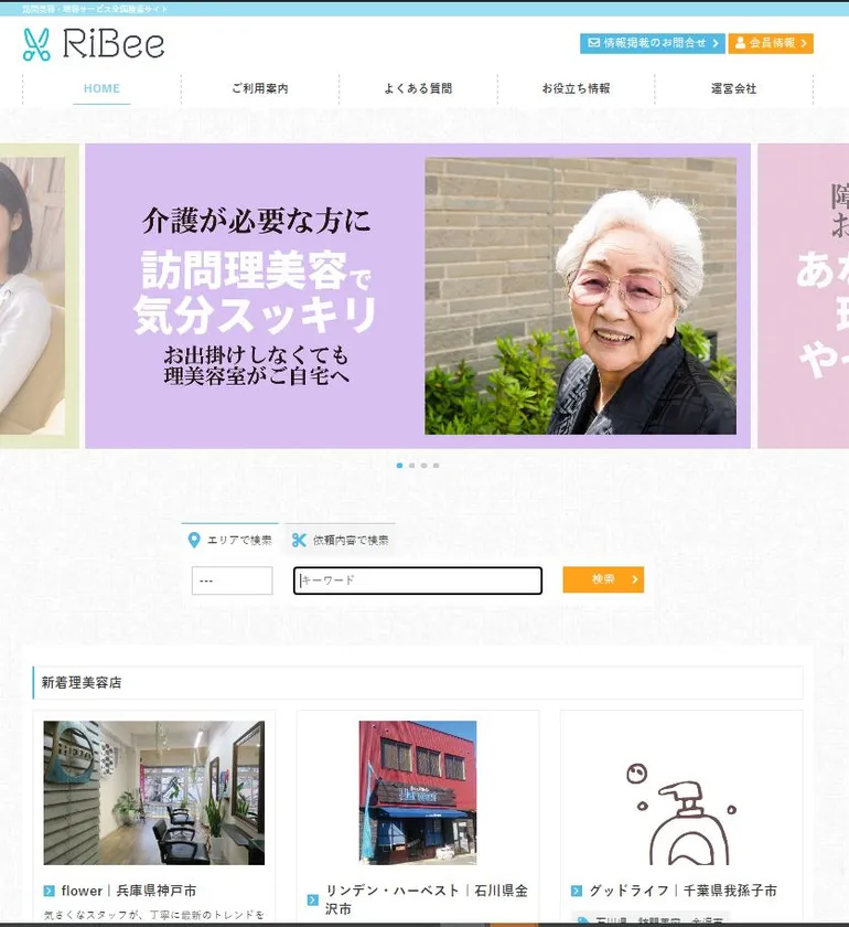 そこで構築したサービスが【訪問理美容サービス全国ポータルサイト「RiBee(リビー)」】です。当社がこれまで関わってきたインターネットの技術・知識を活かし、『訪問理美容業者様が高額な費用をかけずにインターネット上でユーザーに告知することができ、サイトユーザー様は訪問理美容の情報が得られ、事業者を選択できる機会を得られる』ポータルサイトを提案いたしました。