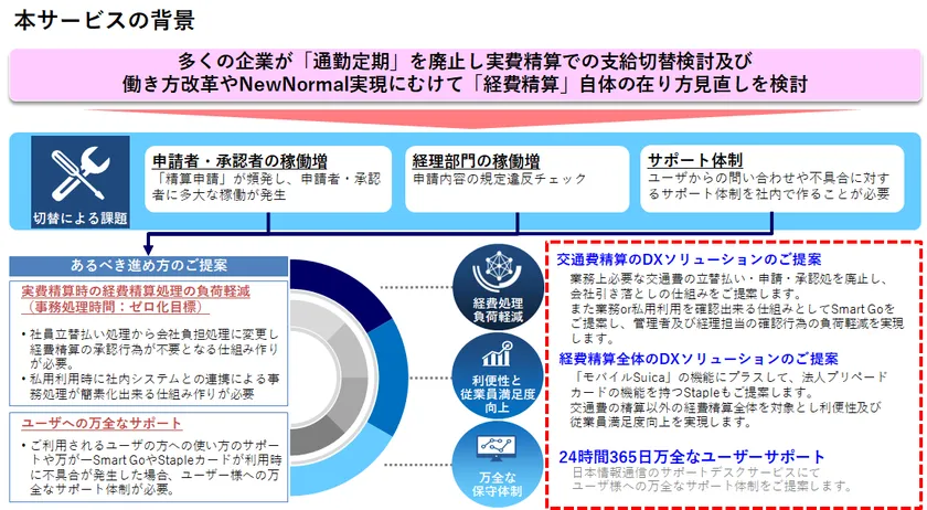 本サービスはこれらの課題を解決するため、「モバイルSuica」と与信不要の法人プリペイドカードを活用し、経費精算のデジタル化を実現します。