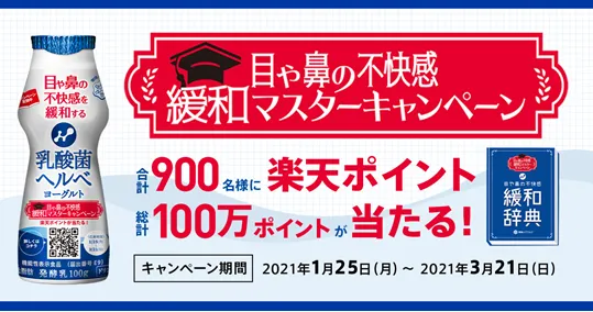 本キャンペーンを通じて、「乳酸菌ヘルベヨーグルト ドリンクタイプ」の目や鼻の不快感を緩和する機能や特長をより広く知っていただくとともに、ヨーグルト市場の活性化を図ってまいります。