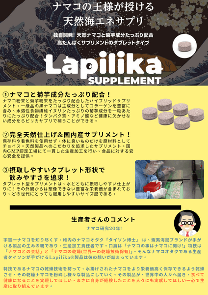 Lapilika®️カプセルは、海のエネルギーであるナマコ成分を300mg(一粒あたり)配合した高機能高たんぱくサプリメント。北海道(蝦夷)の海で育った栄養豊富なナマコ成分がたっぷり配合されています。40粒入りと120粒入りから選べる内容量。