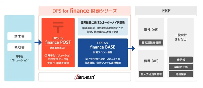 株式会社NTTデータ イントラマート(本社:東京都港区、代表取締役社長:中山 義人 以下、イントラマート社)は、主に財務・経理担当者が関わる経理業務を改善し、請求書や各種証憑類の電子化および継続的に業務改善をサポートするソリューション基盤「DPS for finance 財務シリーズ」を2021年1月にリリースします。本ソリューション基盤は、顧客接点領域からバックオフィス業務につながる全ての業務プロセスをデジタル化・自動化し、属人化の解消や業務効率・顧客エンゲージメントを向上させる総合ソリューション「intra-mart DPS(Digital Process Solutions)」のラインナップの一つです。