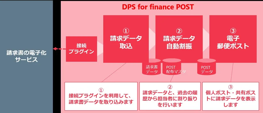 予め用意されたコンポーネントを利用することで、請求書を電子化する外部サービスと容易に連携できます。PDFなど電子化された請求書はシステム上の電子郵便ポストで受領し、業務システムで利用できるデータに編集され、担当者に自動で割り振るため、処理の抜け漏れがなくなります。編集されたデータは会計システムと連携し、そのまま利用できるため、システムごとに変更する手間と時間を削減できます。