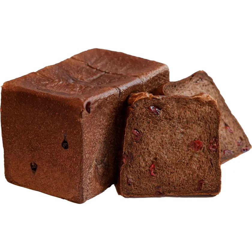 しっとりやわらかい食感と国産バターと発酵バター、やさしい甘さが特徴の国産のさくら蜂蜜を加えた芳醇な香りが特徴の食パン生地に、クーベルチュールチョコレートを練り込んだほろ苦く香ばしい風味の生地に、甘酸っぱい酸味のクランベリーをたっぷり練り込んだ、カカオの味をそのままに感じられる大人の味わいの特別な食パンです。