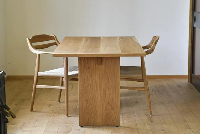 直線的でシンプルなデザインのダイニングテーブル。天板の反りや木口割れを防止するための加工方法を取り入れた完全手作りです。それぞれ違う表情を見せる板の木目のバランスを考え、時には板をつなぎ合わせたり、丁寧に削ったりと丹精を込めて作られるため、木の手触りや温もりを感じられます。天然素材のオイルで仕上げることで、傷や紫外線による経年変化が起こり、木そのものの色や性質を長い時間楽しめます。
