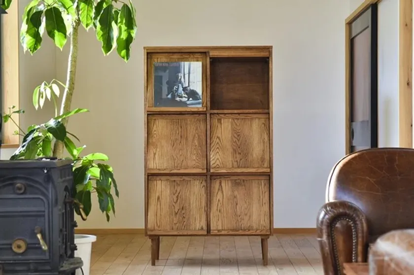 フリップ式の扉を採用した、2列+3段の縦長仕様のレコードラック。扉の前面には、レコードや本や雑誌を飾ることができるため、インテリアとしても素敵です。限られた部屋のスペースでも十分に収納できる縦長のレコードラックは、無垢材ならではの重厚感もありながら、とてもスタイリッシュ。思いが詰まったレコードや本を飾ることで、心が和む豊かな時間をお過ごしいただけます。