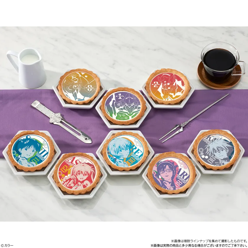 “エヴァンゲリオン”シリーズ に登場する初号機、零号機、2号機に加え、碇シンジ、綾波レイ、式波・アスカ・ラングレー、渚カヲル、真希波・マリ・イラストリアスの5人をラインナップし、全8種のデザインフォルムをのせたタルトです。