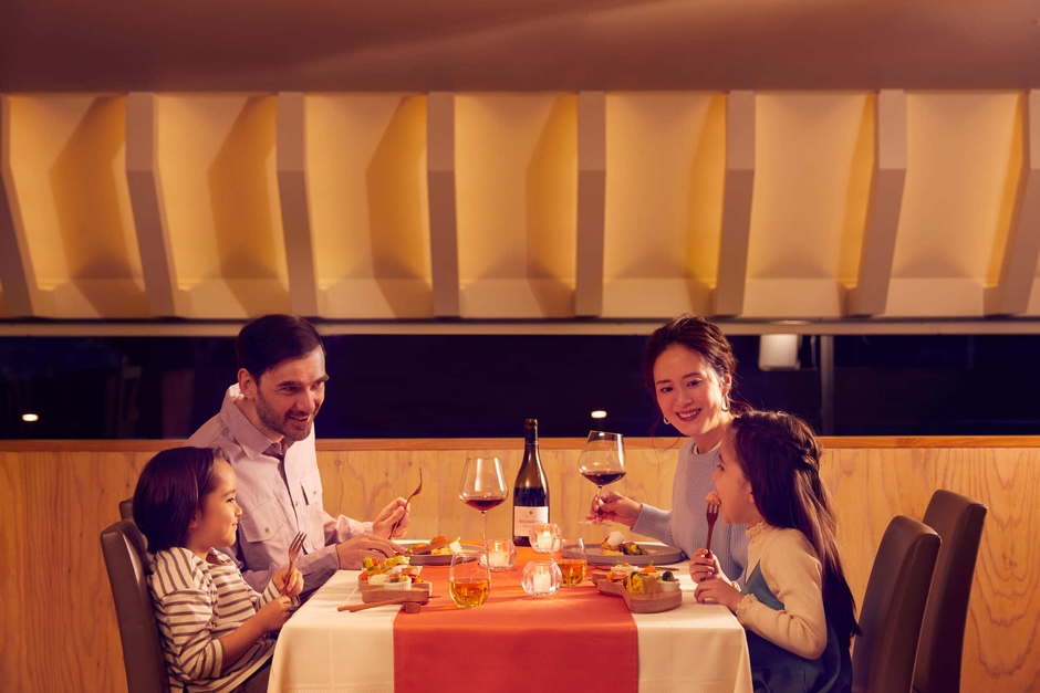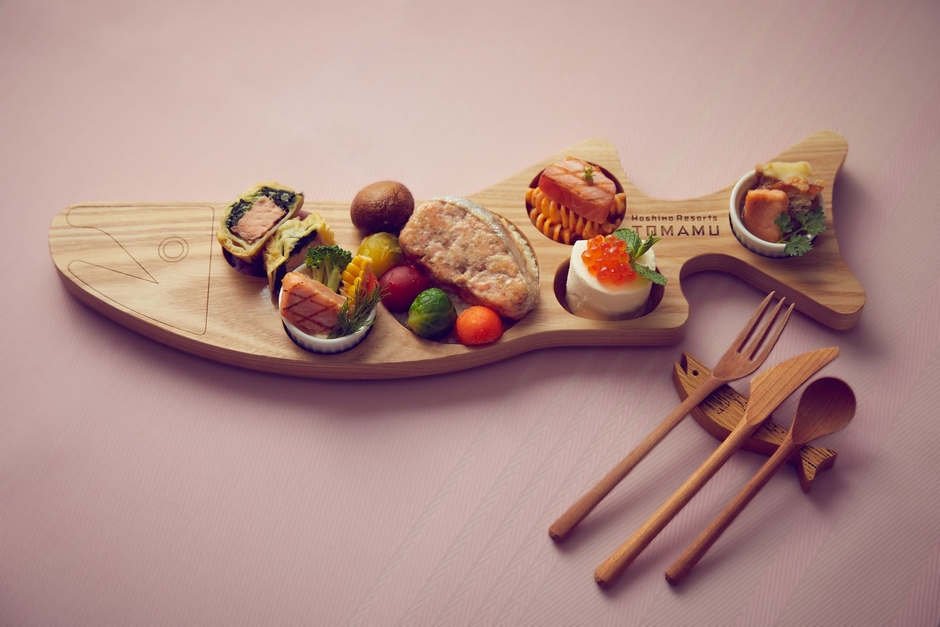 鮭のさまざまな部位を使った夕食を用意します。お子さまは鮭の部位別のメニューを載せた鮭型の「お子さま鮭プレート」、親御さまには、鼻先から背や腹まで鮭を余すところなく使用した鮭のコース料理「鮭ディナー」を提供します。