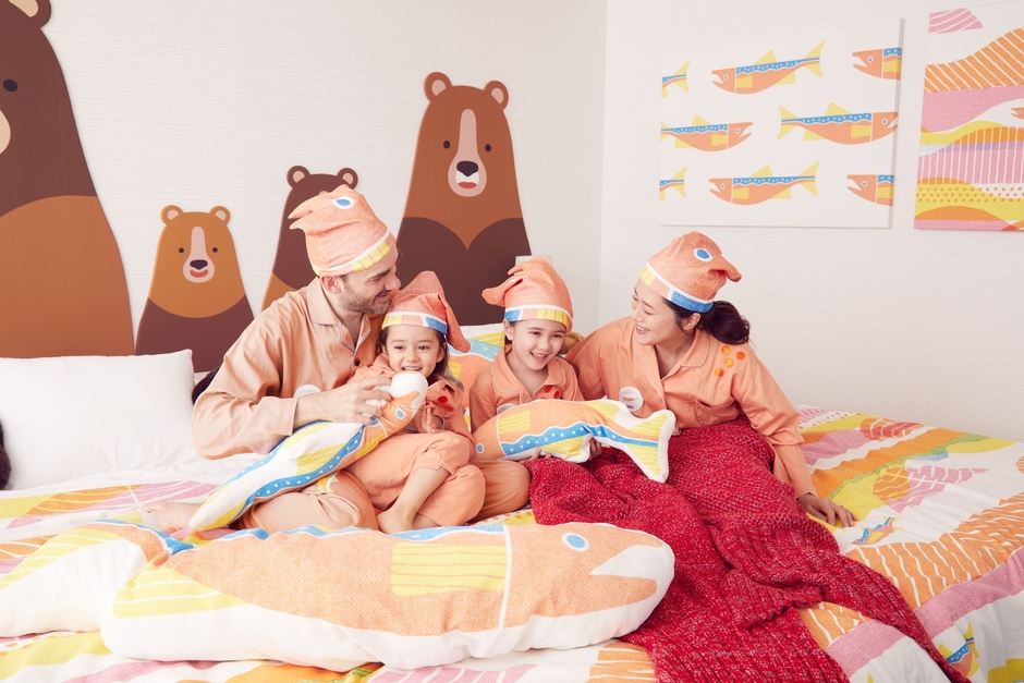 当プランで宿泊できるのは、鮭の切り身や鮭の姿がデザインされたカーテンやクッション、マグカップなどを設えた鮭ルームです。ベッドルームは、川を泳ぐ鮭を表現した空間で、ベッドフレームには、川で鮭を狙う親子のクマが描かれています。鮭の顔がデザインされたナイトキャップと、パジャマを着ると、ファミリーで鮭になった気分を味わえます。