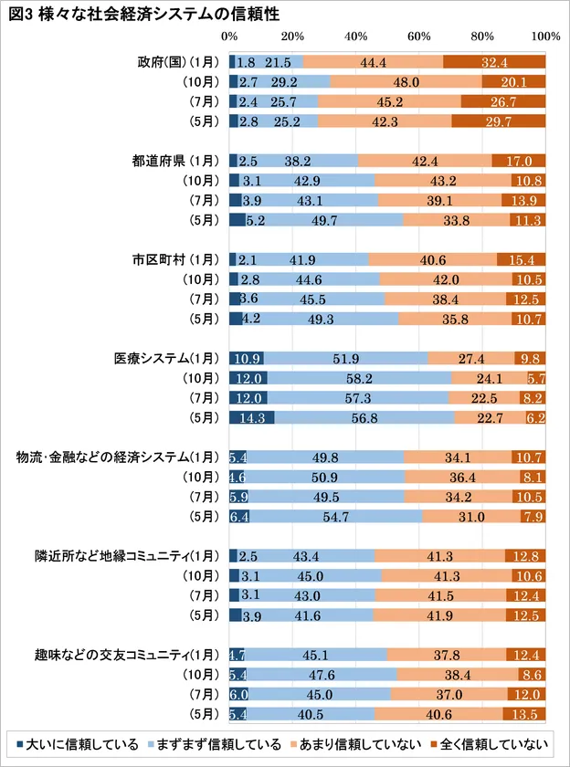 ・政府(国)に対して「全く信頼していない」が前回(10月調査)の20.1%から32.4%へと大幅増で過去最多、「あまり信頼していない」(44.4%)と合わせると76.8%。都道府県、市区町村も「全く信頼していない」が過去最多となるなど、行政への信頼性の低下が目立つ(図3)