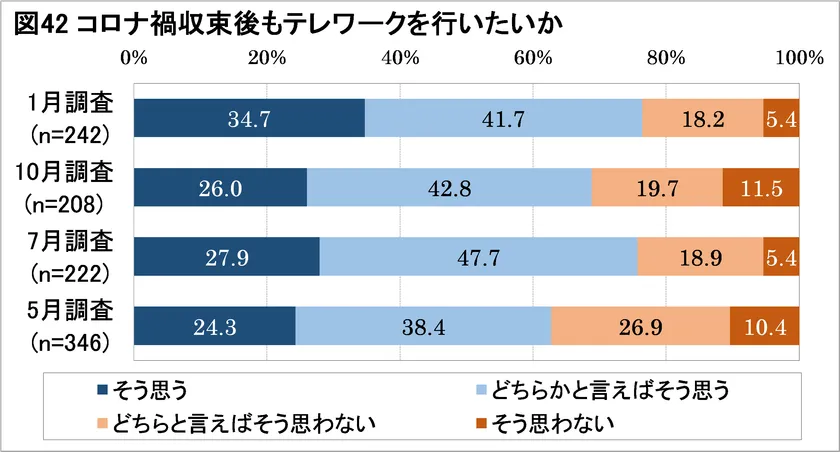 ・コロナ禍収束後もテレワークを行いたいかについては、「そう思う」が34.7%と10月調査の26.0%から増加。テレワークを望む回答は76.4%(「そう思う」「どちらかと言えばそう思う」の合計)で、過去4回の調査で最多(図42)