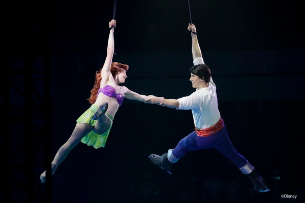 また、全編を通して、エアリアルやトランポリンを使ったアクロバットなども多く取り入れられていたのが印象的だった。特にアリエルとエリック王子のペアダンスで、二人が手を取り合って空中を舞うシーンは、本公演のハイライトとも言える素晴らしいダンスで、会場中が大いに盛り上がった。