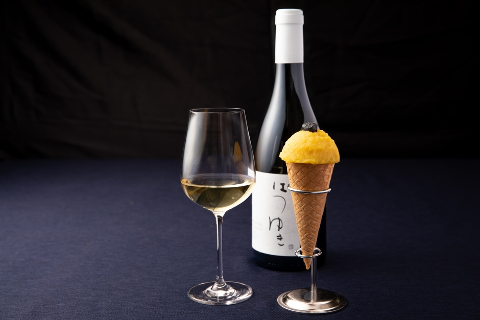 トマム牛乳(*2)のポテサラジェラートは甘さが特徴のインカのめざめとトマム牛乳を合わせ、スイーツ感覚で食べられる一品です。これには、収穫時期を遅らせ、最大限糖度を上げた「NIKI hilsワイナリー」のHATSUYUKI LateHarvestが良く合います。上品な甘さのワインと合わせることで、大人のスイーツへと変化します。