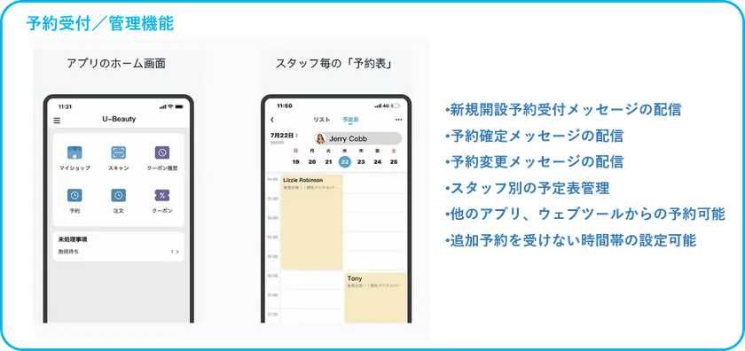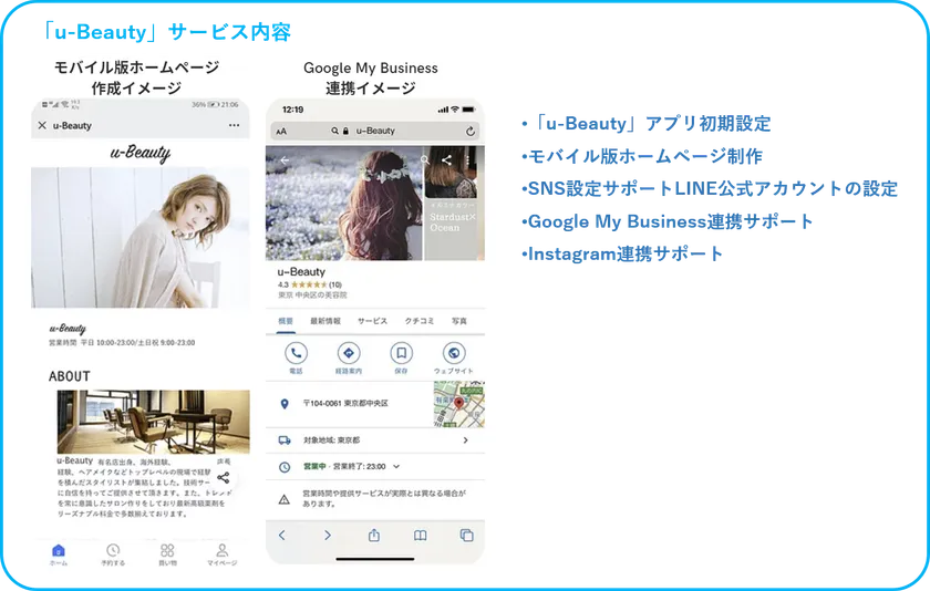 「u-Beauty」は、SNSを組み合わせて新規顧客を獲得しリピーターを増やすことに特化した、美容業界向け集客支援&予約管理サービスです。オリジナルのアプリを使用してLINE公式アカウントの開設やホームページの作成、予約など一元管理化。コロナによって客数、売上の減少に苦しむ美容業界を支援するため「コロナに打ち勝つサロンの最強ツール」として開発されました。