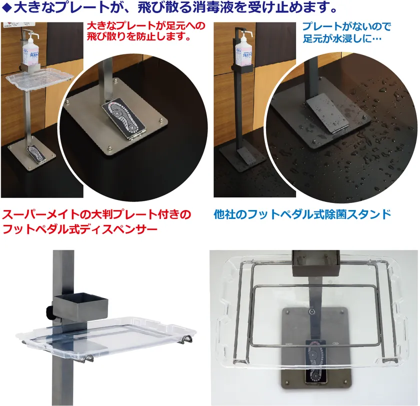 スーパーメイトのフットペダル式ディスペンサーは、大判の飛散防止用プレートで消毒液の飛び散りを防ぐことで、転倒などのリスクを減らすと同時に消毒する環境への美観にも配慮しています。