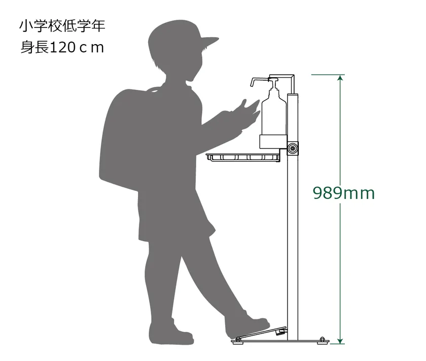 スーパーメイトのフットペダル式ディスペンサーは、最適なスタンドの高さを研究し、低学年のお子さまでも安心して使えるように消毒液の噴出する高さにも配慮しました。