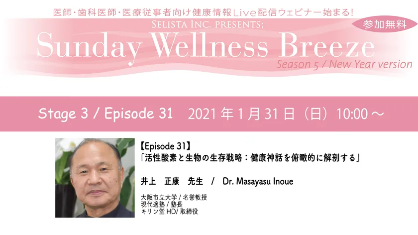 活性酸素研究の第一人者が語る! 「活性酸素と生物の生存戦略: ~健康神話を俯瞰的に解剖する~」 井上正康先生 / 大阪市立大学/名誉教授 医師・歯科医師・薬剤師向け無料Liveウェビナー 『Sunday Wellness Breeze』 2021年1月31日(日)朝10時~開催!