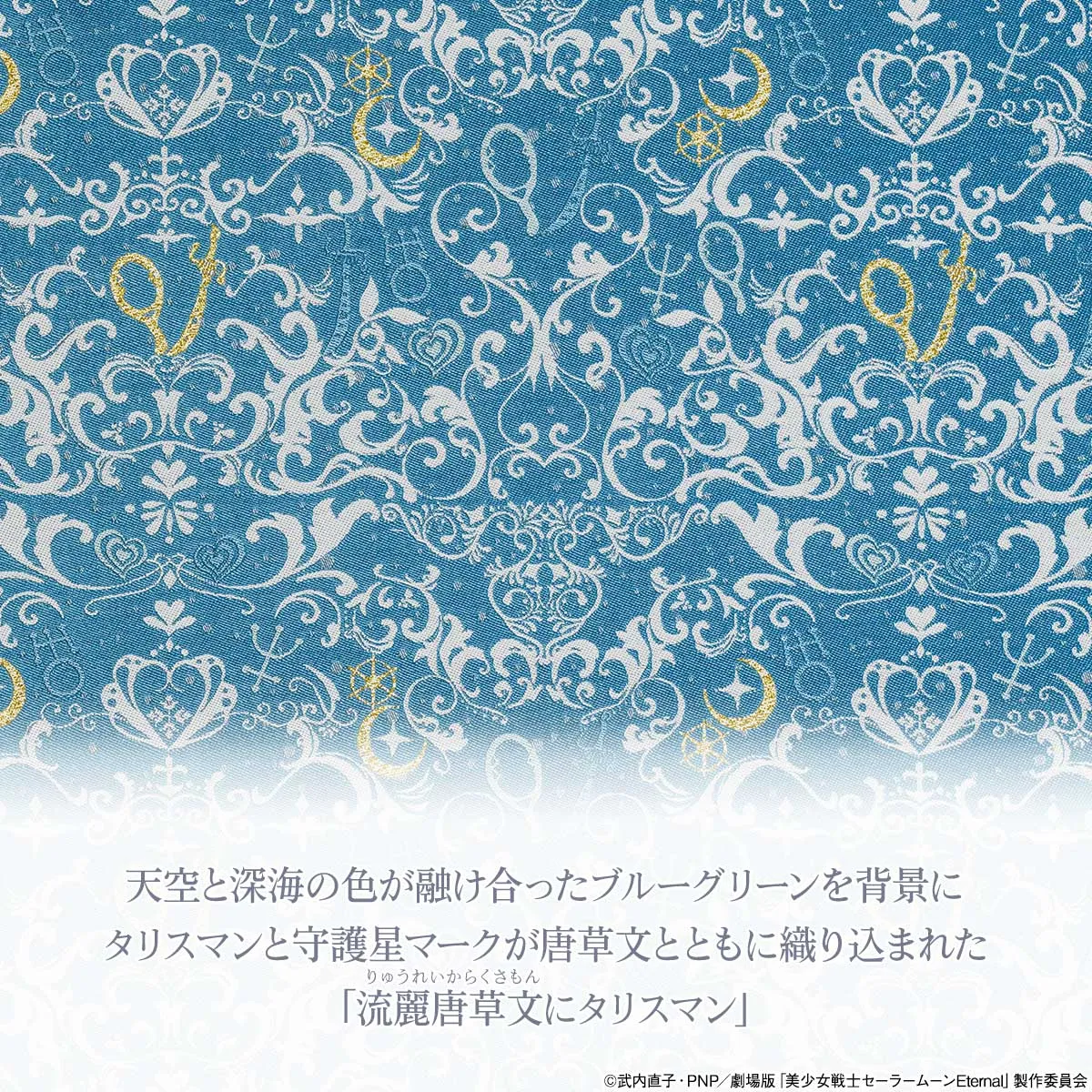 流れるように優美で、息を呑むほど精緻なその文様は、京都の職人による匠の技の結晶。天空と深海の色が融け合ったブルーグリーンを背景に、スーパーセーラーウラヌスとスーパーセーラーネプチューンのタリスマンと守護星マークが、伝統の唐草文とともに織り込まれています。