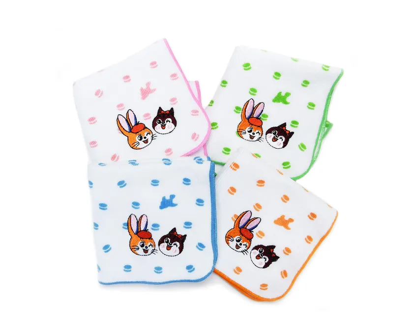 クッピーラムネのうさぎとリスの可愛いらしい刺繍が入った、今治産のタオルハンカチ。