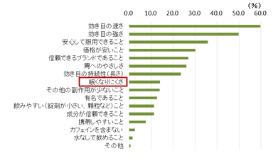 ユーザーに、市販されている薬の中で、どの薬に「眠くなりやすい成分」が含まれているかをたずねたところ、総合感冒薬(59.4%)や鼻炎治療薬(56.9%)に比べ、解熱鎮痛薬に「眠くなりやすい成分」が含まれているタイプもあることを知っていた人は36.2%と低い結果でした。また、解熱鎮痛薬購入時に、「眠くなりにくさ」を重視しているユーザーは13.5%でした。解熱鎮痛薬ユーザーは、薬による「眠気」をあまり意識せずに購入し、使用していることが示唆されました。