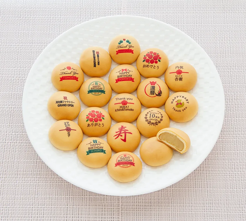 「オリジナルプリント月化粧」は1個180円、小ロット(50個)からご注文頂くことができる、ノベルティスイーツです。最短1週間という短納期と、簡単に学校や会社のロゴ、オリジナルメッセージを、小さい子供から年配の方まで広い世代の方に好評な「月化粧」の表面にプリント可能です。大切な記念日やお祝い事などの贈り物にぴったりな商品です。