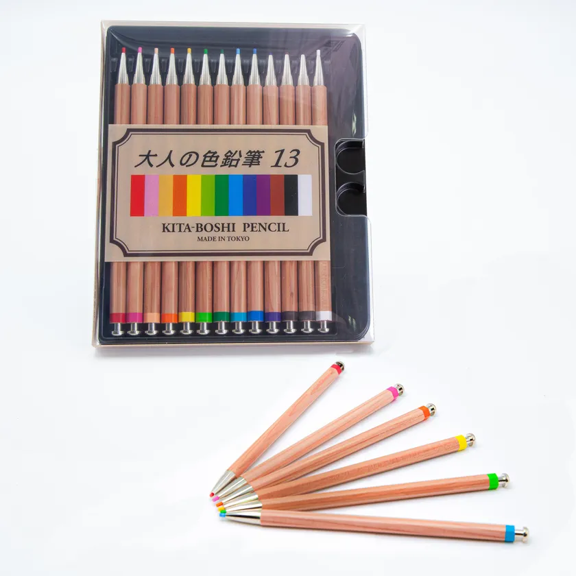 大人の鉛筆発売から10年、創業70年を記念して「大人の色鉛筆13」を製品化いたしました。13色の国産芯を入れたフォルダータイプの色鉛筆で、木軸部分にはアメリカ産インセンスシダー材を使用しています。