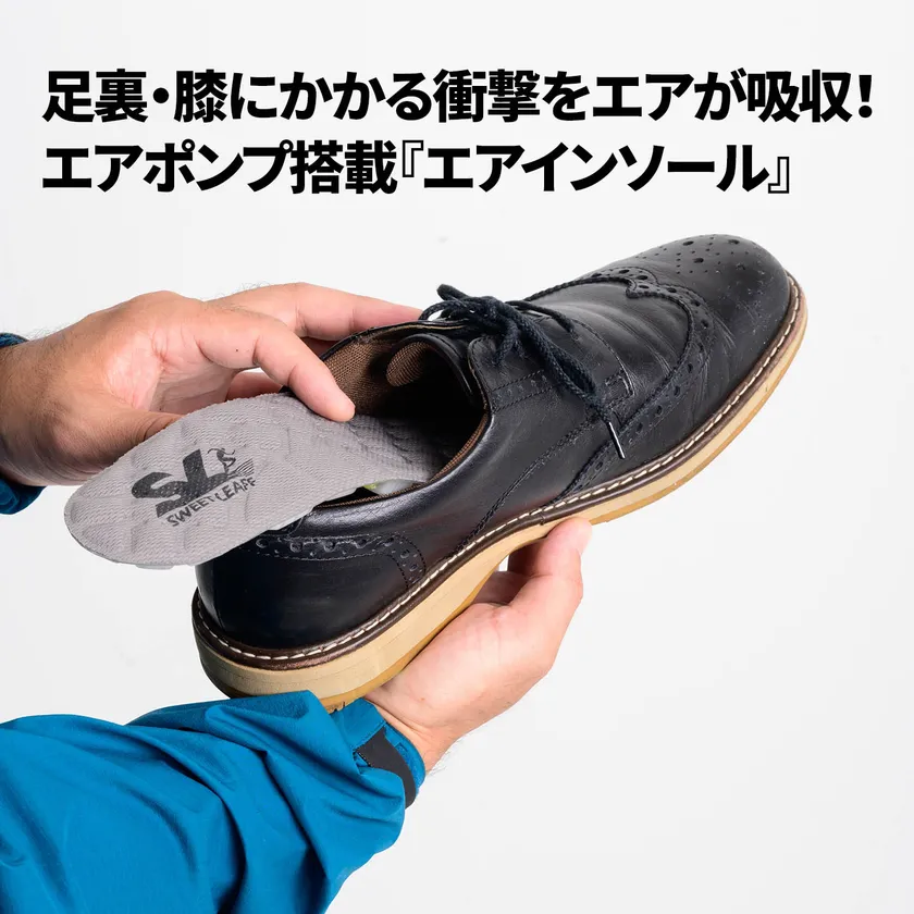 『エアインソール』は、クッション性を自由に調整できるエアポンプ搭載のインソールです。効率よく足裏に掛かる圧力を分散するため、歩行時の足やひざ・腰の負担を大きく減らし、快適で軽快な履き心地を実現します。