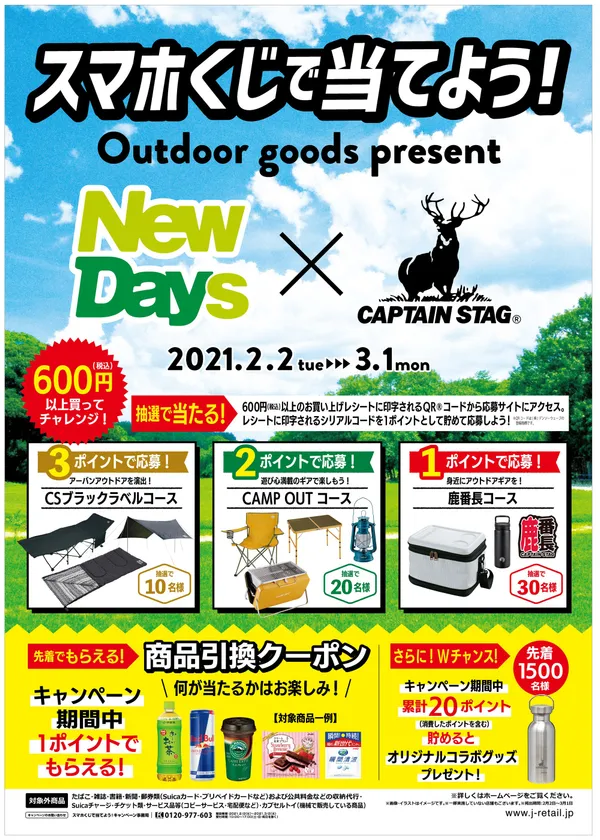 株式会社JR東日本リテールネット(本社:東京都新宿区西新宿/代表取締役社長:高橋 眞)が運営する「NewDays」では、「スマホくじで当てよう!NewDays×CAPTAIN STAG(R) アウトドアグッズプレゼントキャンペーン」を2月2日(火)より実施いたします。