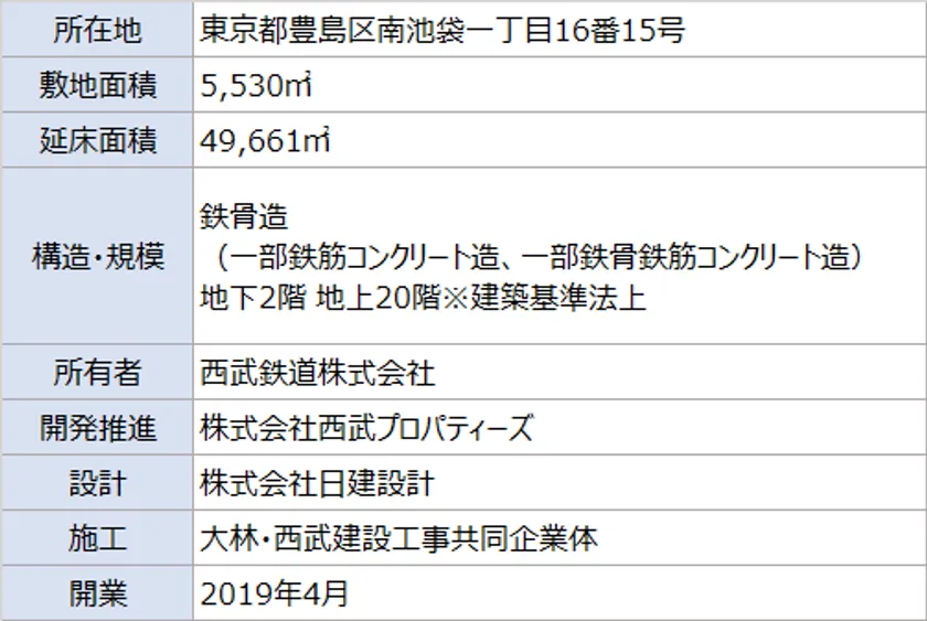 オフィス基準階貸室面積は池袋エリア最大の約2,100m2(約640坪)となり、総貸室面積では池袋エリアでトップクラスです。線路を跨いで建ち、鉄道の運行図表であるダイヤグラムをイメージした特徴的な外観は、西武鉄道をご利用いただくお客さまを池袋に迎え入れ、送り出すゲートとしてあり続け、西武グループの拓かれた未来への玄関口であることを演出しています。