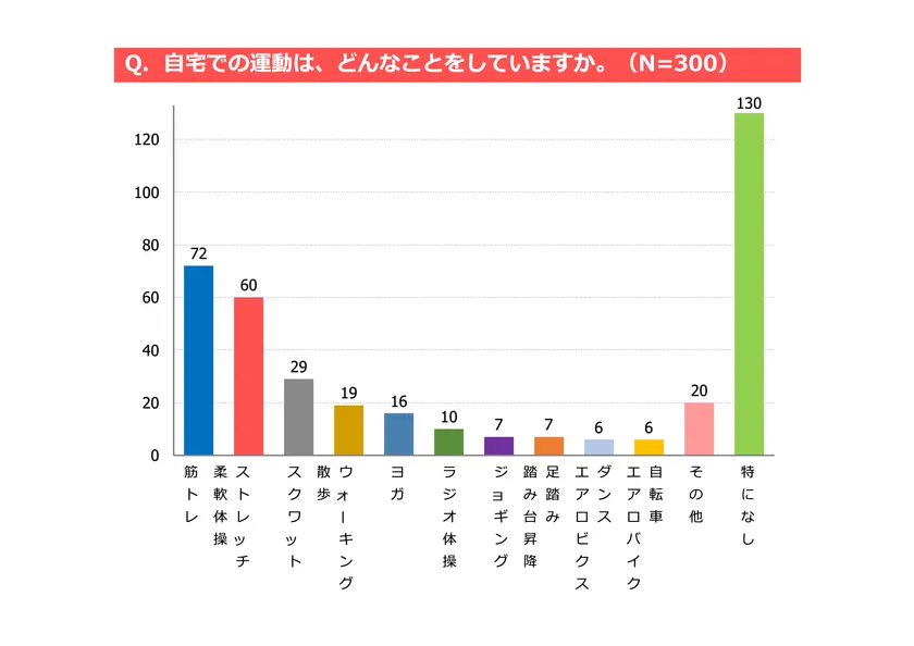 「“自宅”での運動は、どんなことをしていますか?」(複数回答可能)という質問に対して、1位「特になし」34.0%(130人)、2位「筋トレ」18.8%(72人)、3位「ストレッチ・柔軟体操」15.7%(60人)、4位「スクワット」7.6%(29人)という結果となりました。一方で、60.7%の方が自宅で何らかの運動をしており、外出自粛が要請される中、自宅で運動不足を解消しようという動きも伺えます。