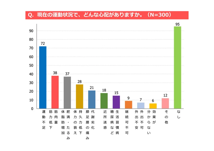 「現在の運動状況で、どんな心配がありますか?」(複数回答可能)という質問に対して、1位「なし」26.5%(95人)、2位「運動不足」20.1%(72人)、3位「筋肉量・筋力低下」10.6%(38人)、4位「肥満・たるみ・体脂肪増加」10.3%(37人)という結果となりました。体への悪影響を心配している人が6割を超えており、現在の運動状況の健康への懸念を多くの方が持っていることが伺えます。