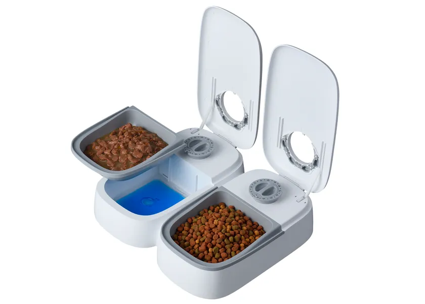 2食分を最大48時間まで簡単にセットができ、セットした時間が経過するとトレーのフタが開きます。1食分で約150gのフードがセット可能で、ドライ・ウェットどちらにも対応しています。トレーの下には市販の保冷剤を置くことができるので、フードの鮮度を保つことができます。トレーは取り外せて、水洗い可能なので清潔にお使いいただけます。設置場所を選ばない電池式で、ペットにやさしい静音設計です。
