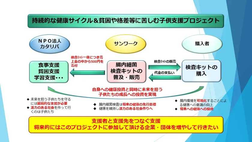 検査キットを購入された方々が、自身の将来の健康への投資を行うと同時に、未来を担う子供たちへの投資・支援を自動的に行えることによって、健康と支援の持続的な循環型の仕組みが作れると信じています。