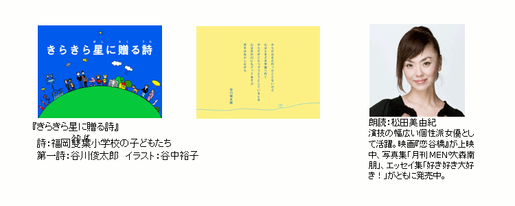 今回の詩集絵本『きらきら星に贈る詩』は、詩人の谷川俊太郎さんが書き下ろした詩を参考として、福岡雙葉(ふくおかふたば)小学校2年生(2010年度当時)の子どもたちが思い思いに綴った詩を絵本にしたものです。
