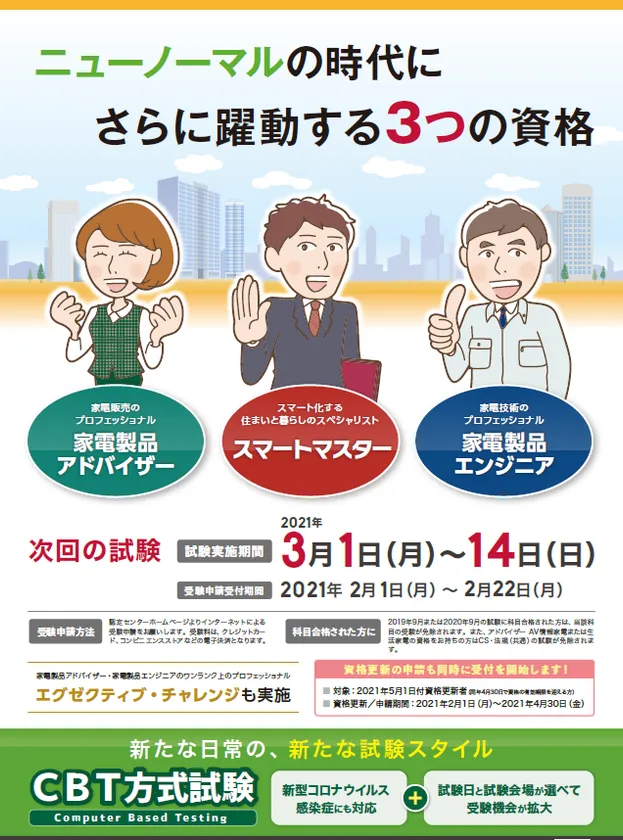ニューノーマルの時代にさらに躍動する3つの資格 「家電製品アドバイザー」「家電製品エンジニア」 「スマートマスター」 2021年3月 第40回(第2回CBT方式)試験の 受験申請スタート!