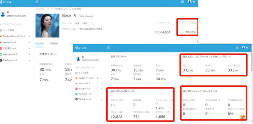 Weiboや小紅書のKOLが過去にどのような広告主から依頼を受けたか、どのような投稿をしたのか、投稿のエンゲージメントはどのくらいかを見ることができ、フォロワー数だけでは分からない情報を調べられます。