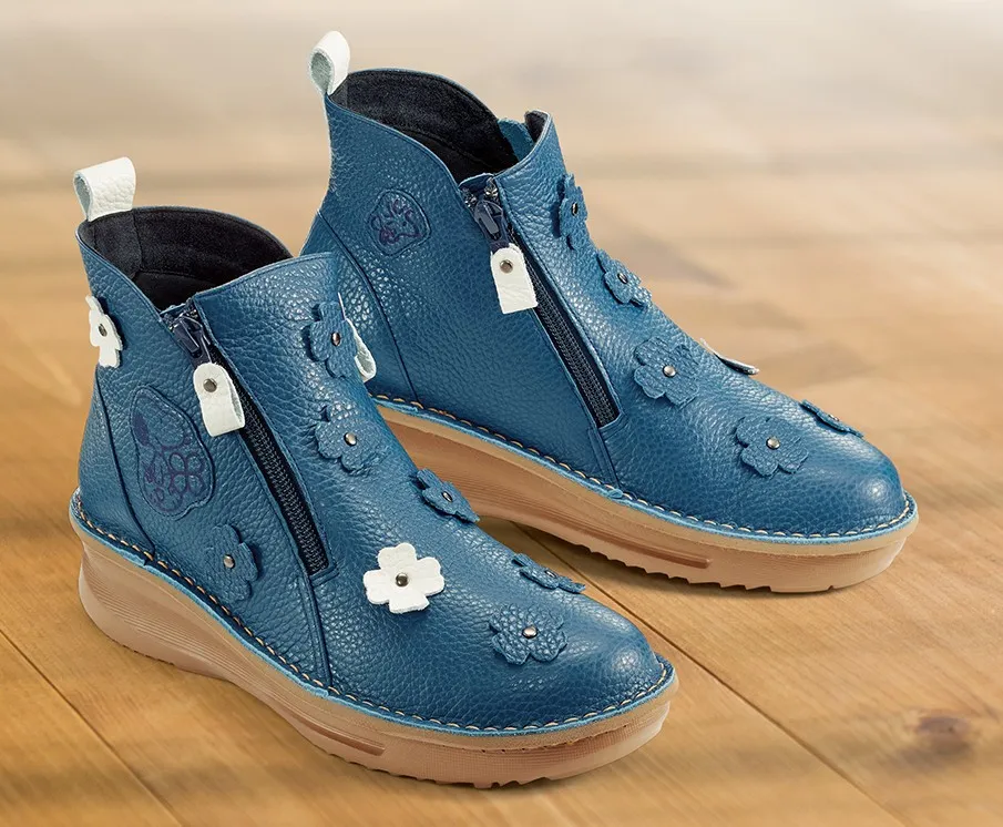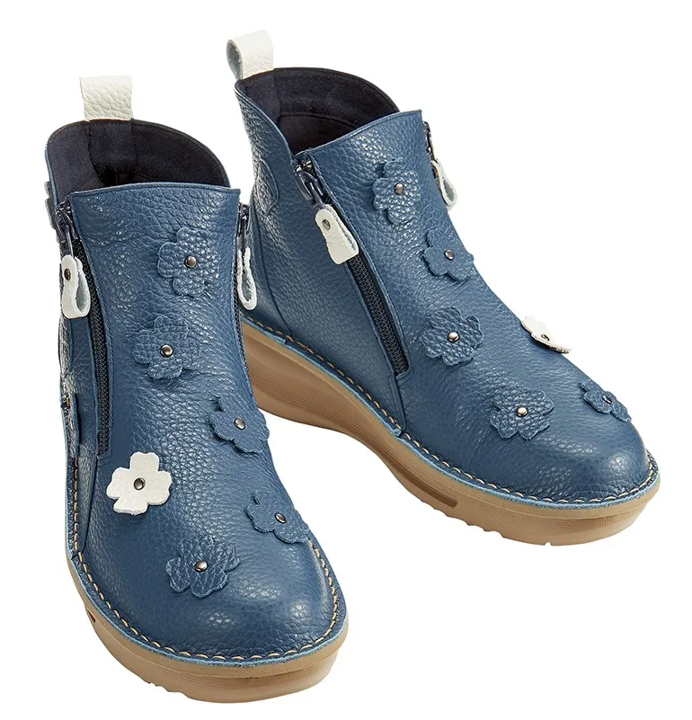 美しいネイビーブルーに染め上げた高級牛革いっぱいに、スヌーピーと探した四葉のクローバーをあしらった、しあわせのブーツ。熟練職人の高度な手仕事ならではの丹念な牛革のカットワークが、歩くたびに足もとからのお洒落を主張して周囲の注目を集めます。