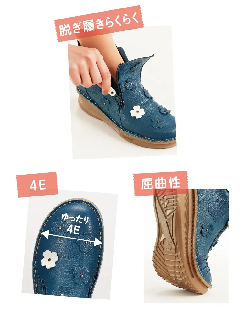 ■ダブルファスナーでさっと着脱、足にやさしい幅広4E。さらにすべりにくいから歩きやすい!