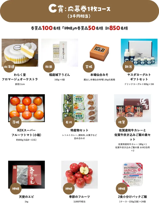 応募券1枚コース(3千円相当)各賞品100名様「神明」の各賞品50名様 計850名様